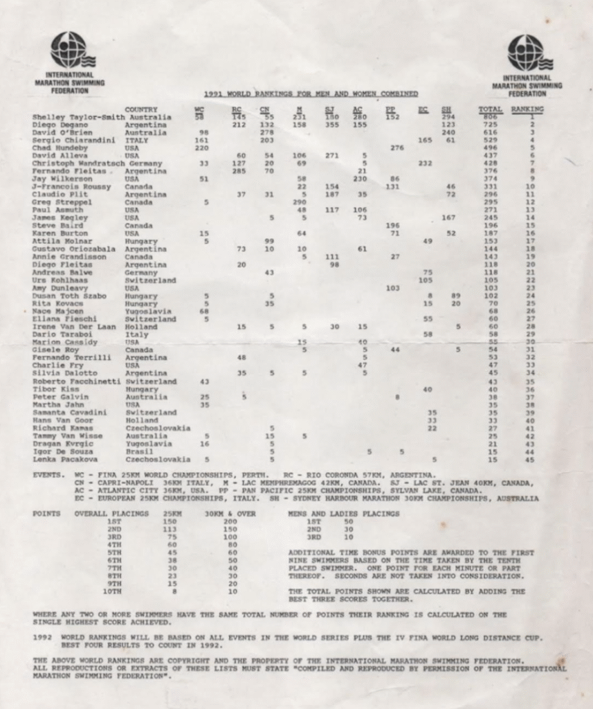 Shelley Taylor-Smith achieved what no other woman has achieved in the history of any sport worldwide – to this day over the course of a season or year. Yes, a small number of women have beaten the top men in a race here and there over the decades in distance running or marathon swimming, but in 1991, a woman achieved the No.1 world ranking overall based on a series of 9 races around the world in different conditions and locations held throughout the year. Her singularly unique achievement was the dramatic catalyst that lead to the improved fortunes and opportunities for women in the sport of swimming.