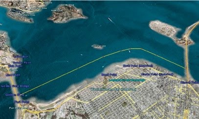 The 3.92 flood refers to the peak flood tide measured in knots – when water coming into the San Francisco Bay. “The swimmers will start beneath the Golden Gate Bridge about mid-span where the water is moving strongest. That 3.92 flood translates into fast water. This enables the swimmers to get a big push into the Bay. As everyone stays on course past Alcatraz, making a right turn toward the water front to the finish at the base of the Bay Bridge.”