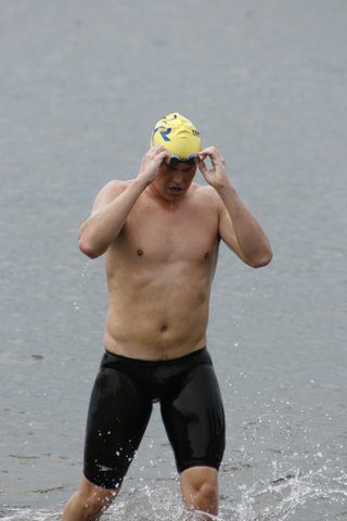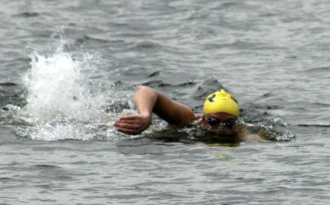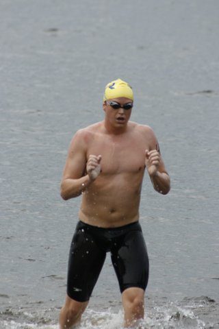 Eric Nilsson: I felt strong from the beginning of the race, taking it out pretty smooth but concentrating on a long efficient stroke and light kick that I thought I would be able to hold for the duration of the race. I found my kayaker with relative ease and I was able to see each of the buoys that I needed to without too much difficulty which was a relief because there was a good bit of distance between each buoy. I like knowing where I am going. I maintained the stroke and was in a good mental state for the entire first half of the race. I would say it went by pretty quickly. The only hitch during the first half was that my kayaker dropped her life jacket and in her attempt to retrieve it, fell behind me and had to be towed back up to me by the state trooper. So I had to choose my own line and swim by myself for 15 minutes or so.