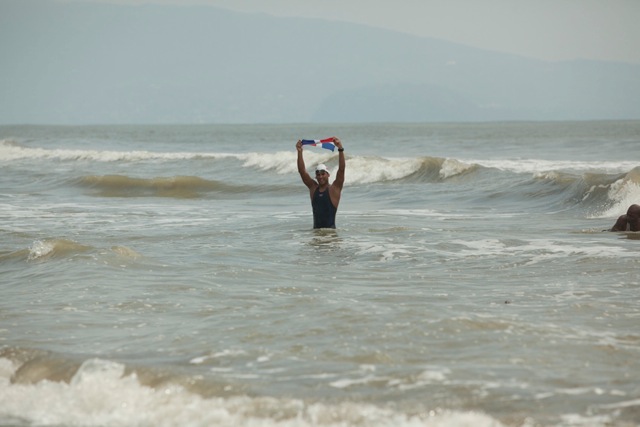 I was very afraid because of the salt water crocodiles. I was surrounded by many escort boats including Indonesia Coast Guards and divers. During the last few kilometers, I face a very strong current against us, but I could see all the people waiting at the finish to that final push was very special [because it was hard and because of the expectations of the crowd].”