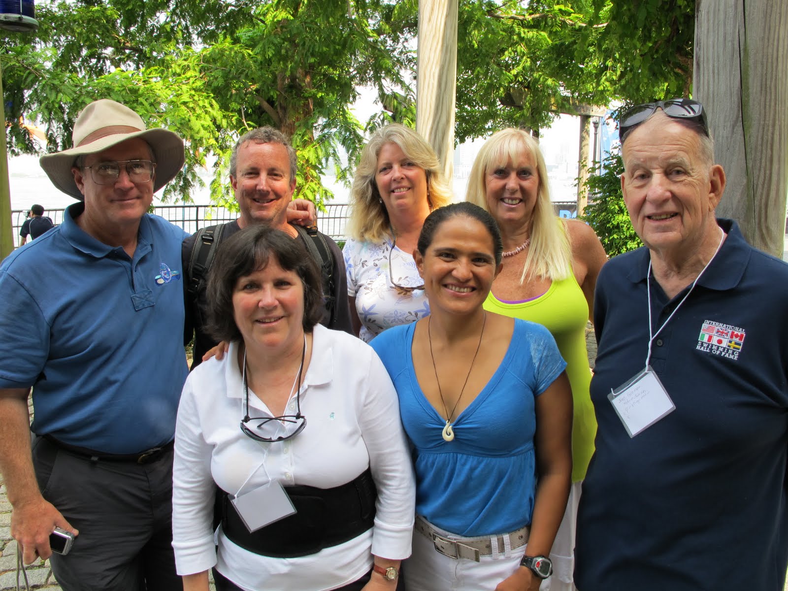 Photo by Skip Storch shows David Clark, John York, Penny Dean, Nora Toledano, Dale Petranech, Anne Cleveland and Paula Selby in New York City for the Catalina Channel Swimming Federation induction ceremonies at the International Marathon Swimming Hall of Fame held at the United Nations.