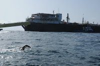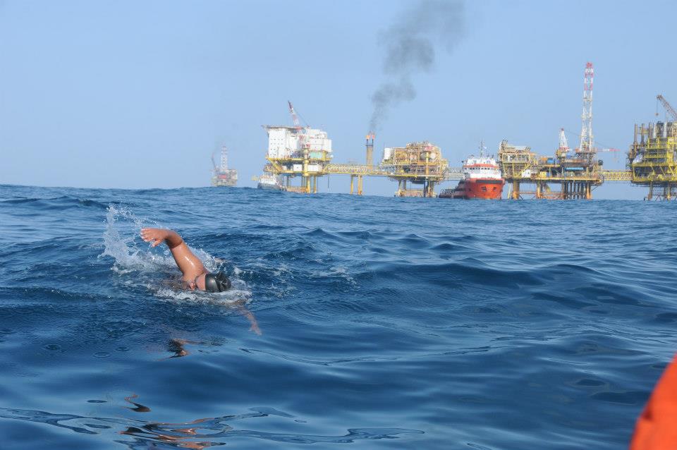 His 10 km swim was aided by the strongest tidal push possible during his 1 hour 35 minute swim where he swam from one platform to the big tanker platform Ifriquya 2 while swimming passed 4 production platforms.
