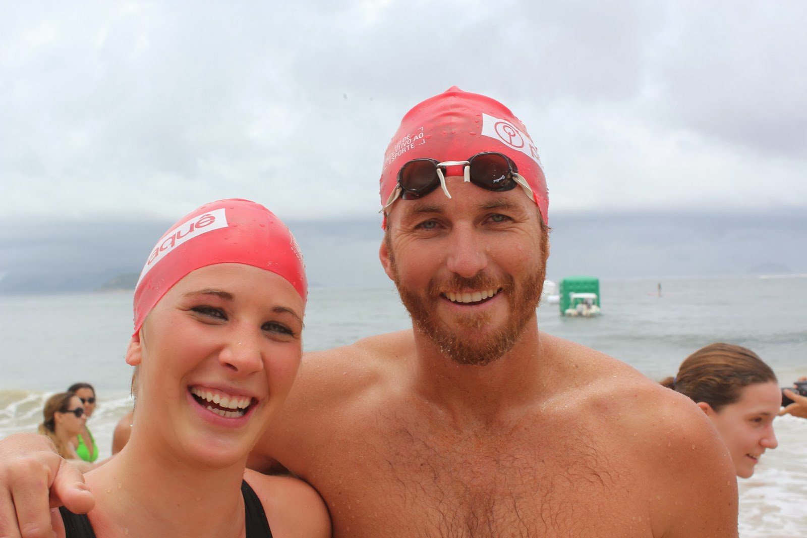 America’s multi-time Olympic champion Aaron Peirsol took two very long flights from his hometown in Newport Beach, California to Brazil and just got through the Rio de Janeiro airport customs and city traffic to barely make it in time for today’s pre-race press conference and 1 km grid relay on Copacabana Beach.