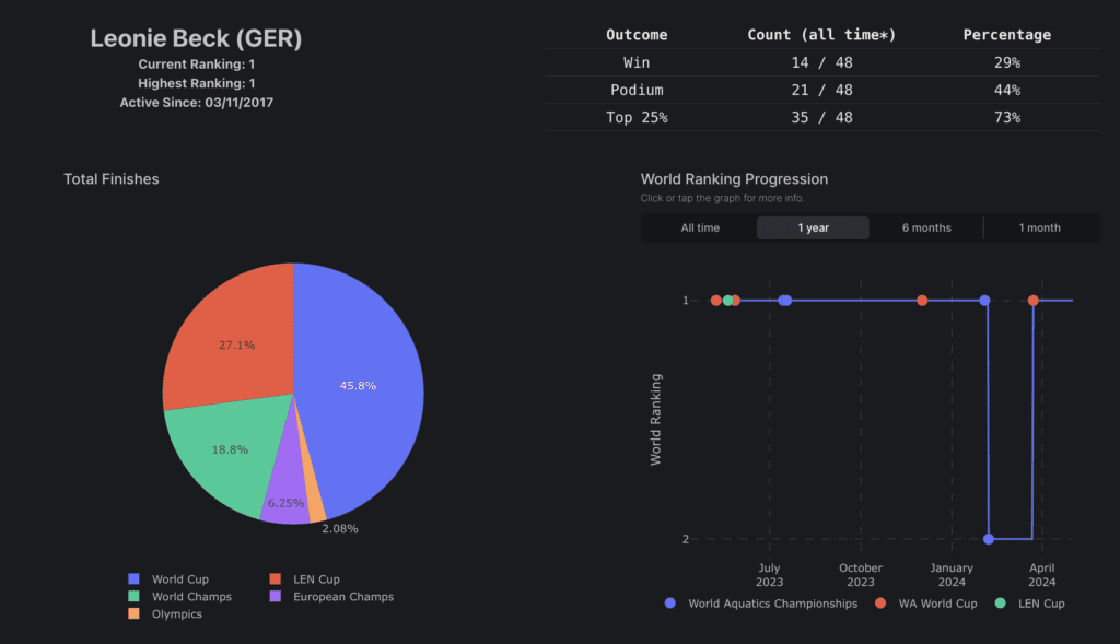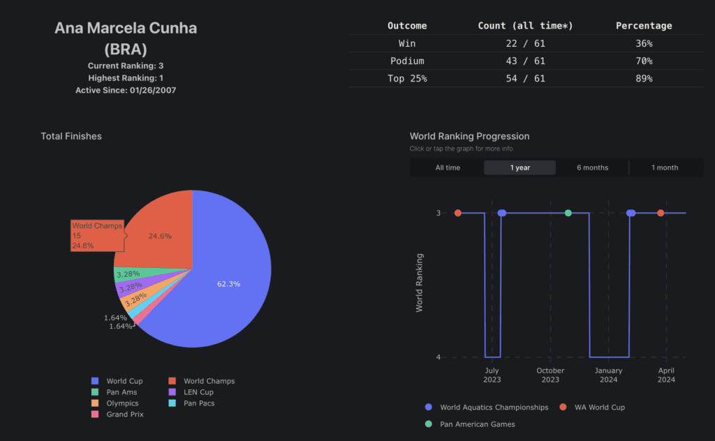 I’ve also created Open Water Insights (OWI), a groundbreaking data insights application that centralizes the sport’s vital information, including results and rankings. OWI doesn’t just collect data; it transforms it into powerful visualizations that help athletes and coaches understand their performance, track progress, and strategize for success.
