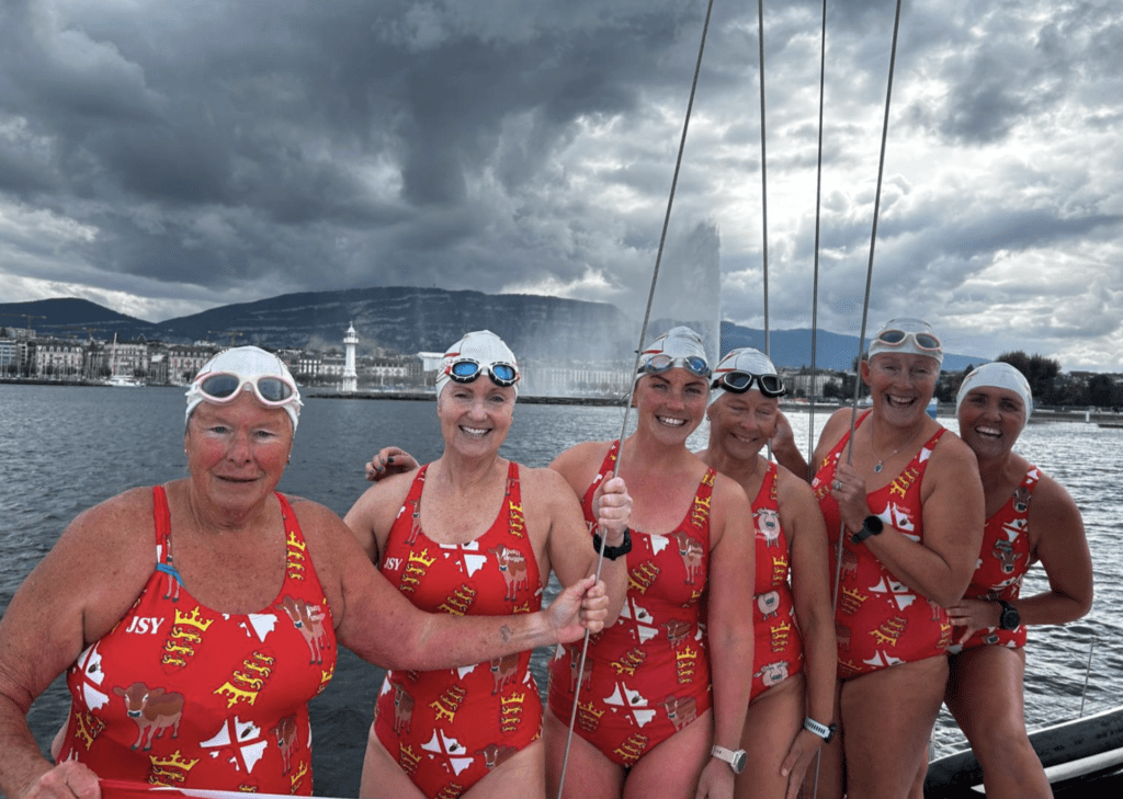Harvey remembers, “After several years of postponements and team iterations, the Jersey Girls finally arrived in Geneva. After taking the train to the start in Villeneuve, I think we all began to realize the enormity of the challenge that lay ahead. We started the swim in calm conditions with a little rain, but the lake soon decided to throw almost every element at us.