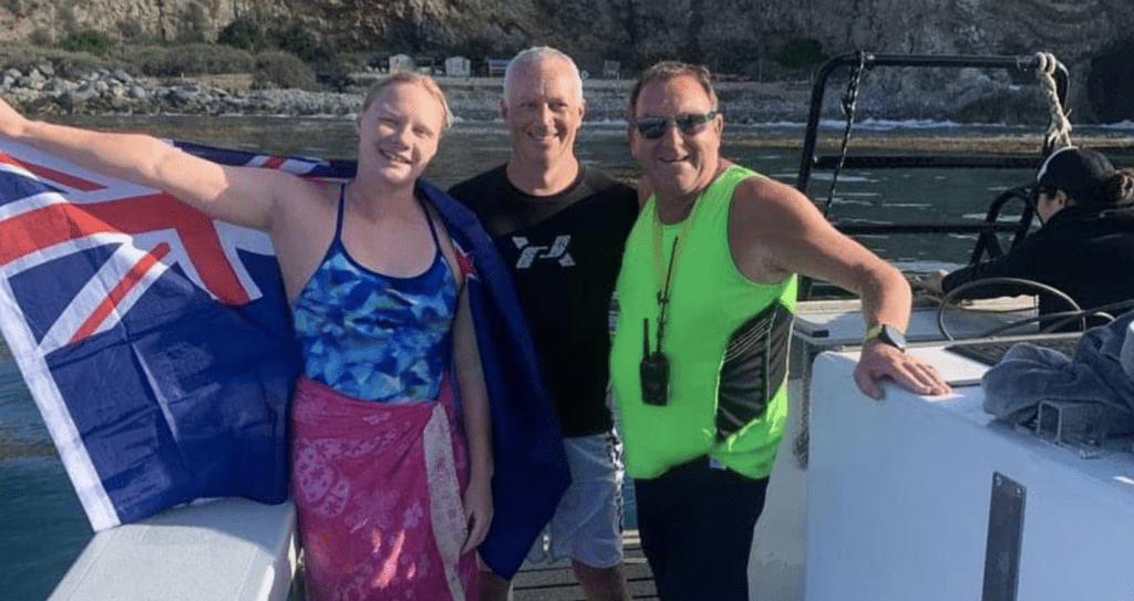 O’Reilly posted on Facebook, “[It was] a great swim. I pushed myself hard and am happy with how it all went. 6 out of 7 Oceans Seven done [with] only one left, Molokai Channel in Hawaii. Thanks so much to the team Bottom Scratcher for all the support and a great day on the water.
