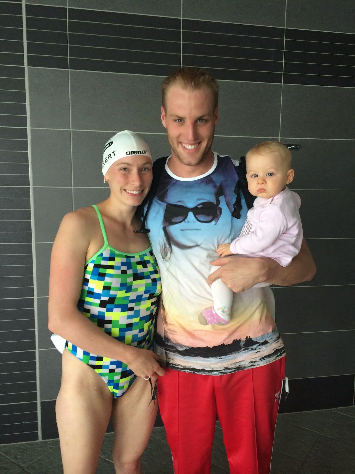 They are shown at the pool deck with their 7-month-old child Mia, preparing for the upcoming Great Scottish Swim.