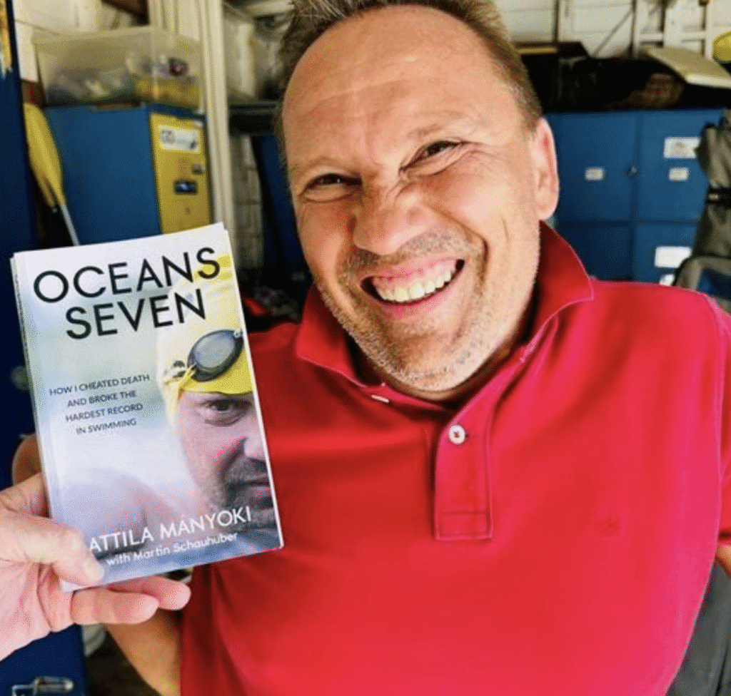 When he achieved the first Calendar Year Oceans Seven in 355 days, Donalidson’s cumulative swim time was 63 hours 2 minutes 9 seconds, the fastest in history. Donaldson broke the previous cumulative time record of Attila Mányoki (52, Hungary, MSF bio here, @attilamanyoki, shown below on right) who cumulatively crossed the Oceans Seven channels in 64 hours 35 minutes.