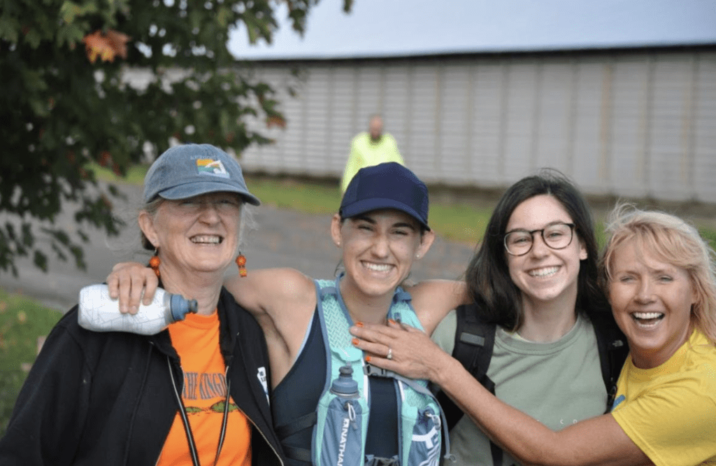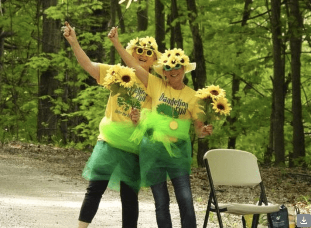 She volunteered for all of our Kingdom Games. She and Pam Ladds were the well-dressed “Turn Around Girls” at the 10 km Turnaround at the Dandy each year for many years. She and Kathleene Marcil would sign the course riding in the back of the pickup going slow over the dirt roads through the dandelion fields and feeling the breeze (like our dog Tito who likes to stick his head out the window). Laughing and talking. And for many years, she volunteered as a “Greeter” or “Go Go Girl” at our Memphremagog Winter Swim Festival, out on the ice, helping direct swimmers to their lanes, sometimes in -10°F weather with feisty winds. She was tough.