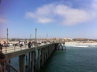 DJ Matty Mitchell‘s booming hits will “keep your head bobbing. Hit the pavement in bare feet and your swim suit, cap and goggles through the quiet peace of Newport Vintage Fishing Village, and a summery body jaunt of swimming around the Newport Pier. Then onto the Balboa Pier and the Huntington Beach Pier (shown above) and back swimming at the home of the Sea Monkeys – the Seal Beach Pier.”