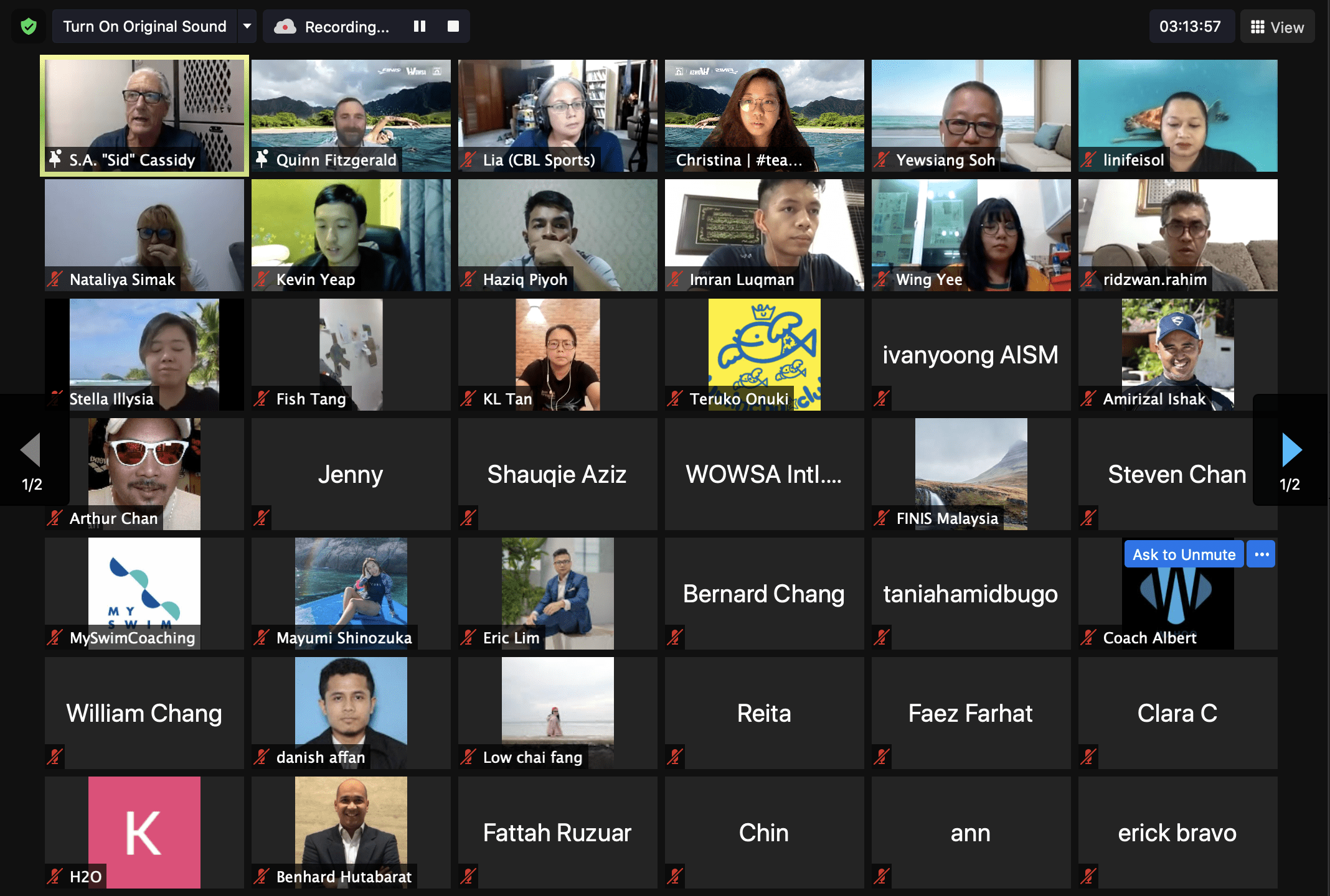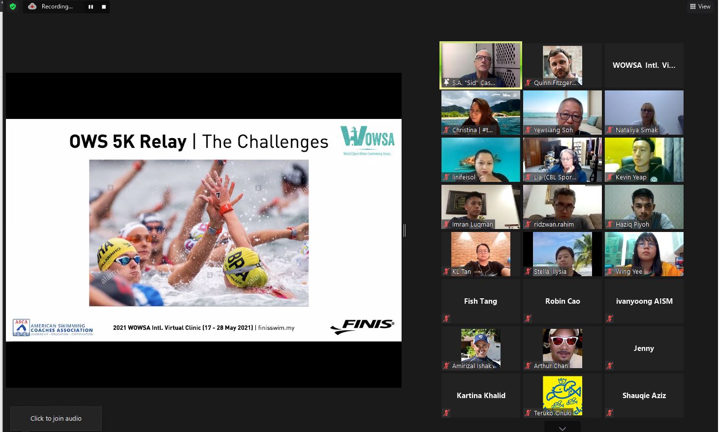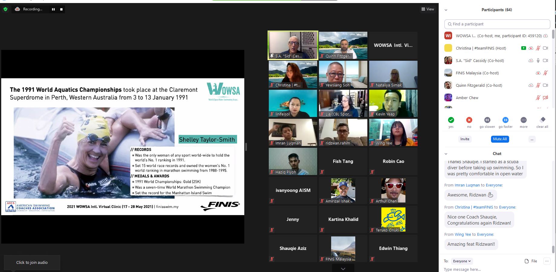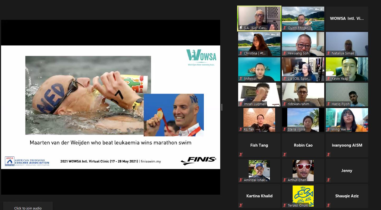 The American Swimming Coaches Association and the World Open Water Swimming Association jointly presented with sponsor FINIS its first virtual open water swimming clinic with 68 participants logging in from Southeast Asia.