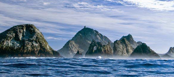 The Farallon Islands, or Farallones from the Spanish farallón meaning “pillar” or “sea cliff”, are a group of desolate islands in the Gulf of the Farallones off the coast of San Francisco, California. They are only occasionally visible from the mainland on clear days. Solo swims and relays to and from the Farallon Islands are governed by the Farallon Islands Swimming Association.