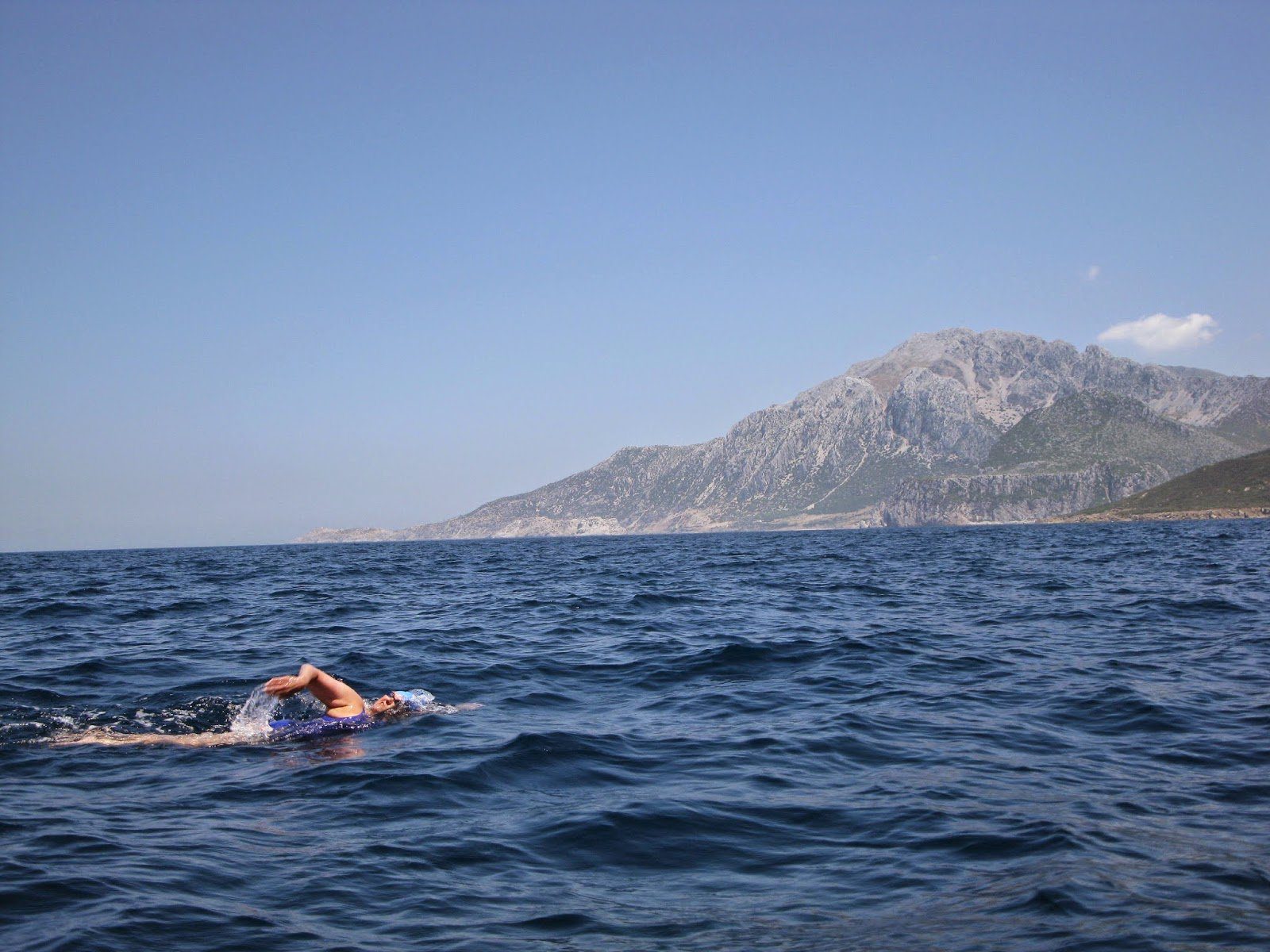 Pat Gallant-Charette shows a nice, flat, streamlined body position at the end of another tough channel swim in the Strait of Gibraltar while outfitted in a blue swim cap and blue swimsuit swimming through some slight chop in royal blue water under beautiful blue skies.