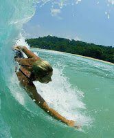 As the power of the wave surges forward and they feel an increased speed, the swimmer kicks hard and enabling the ride to begin. Their hips are elevated as they kick and their head is up and looking forward with an outstretched arm and hand serving as their bow. They take a few good few breaths of air while they can in this position as they come sliding down the face of the wave, significantly moving faster than they ever could simply swimming.