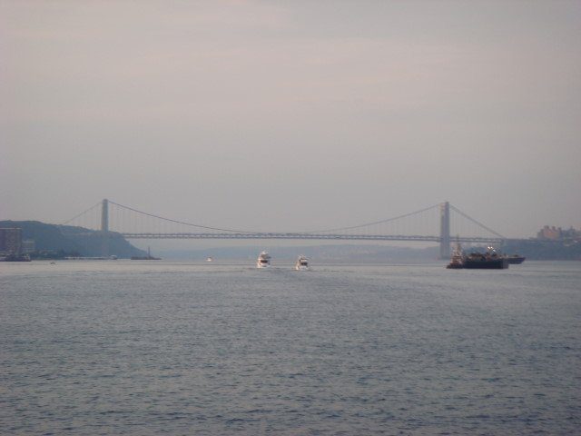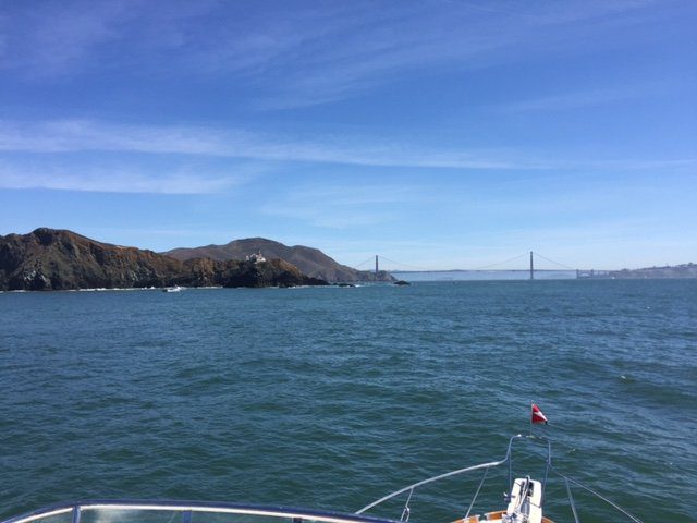 Looking up towards the Golden Gate Bridge spanning the San Francisco Bay in California reminds us of looking up towards the George Washington Bridge spanning the Hudson River in New York from a distance. Two totally different swims (ocean versus river, salt versus fresh, can-be cold versus can-be warm), but the bridges in the distance from the water’s edge can provide somewhat similar side views.