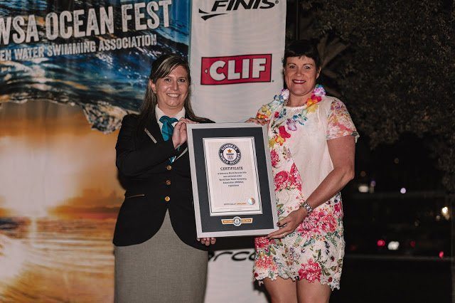 Carmel Collins of Ireland was honored by Guinness World Records for the Longest Distance Ice Swim by a Female at the 2019 WOWSA Ocean Fest in Redondo Beach, California.