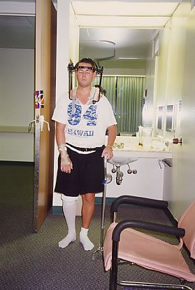 Kammel endured extensive surgery to repair the damaged vertebrae. But the doctors told him that he would never walk again. The words were devastating on one hand, but led to a renewed vigor as Kammel refused to accept their prognosis. After spending three weeks in the hospital in Hawaii and another 26 days in Long Beach Memorial Hospital closer to home, Kammel was inexplicably back training. Still wearing a steel halo brace and confined to a wheelchair, Kammel was figuratively back in his comfort zone, training his clients at his gym and working out with as many machines as he could.