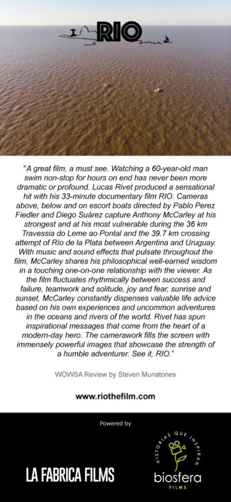 Courtesy of WOWSA, Huntington Beach, California. RIO is a documentary film about 60-year-old Anthony McCarley’s completion of the 36 km Travessia do Leme ao Pontal from Leme Beach to Pontal in Rio de Janeiro, Brazil in 15 hours 33 minutes in November 2019 and his 39.7 km crossing attempt of Río de la Plata between
