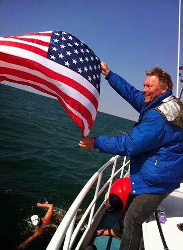Upper photo shows Samuels swimming as Roger Finch of South Africa waves the American flag.