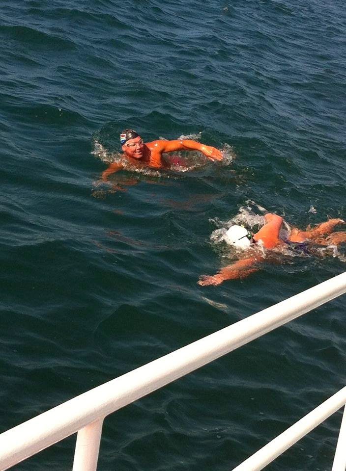 Lower photo shows Finch jumping in as her pace swimmer. Finch was on two historic English Channel crossings in less than a week, serving as a crew member on the solo swims of both 73-year-old Dr. Thaning and 16-year-old Samuels.