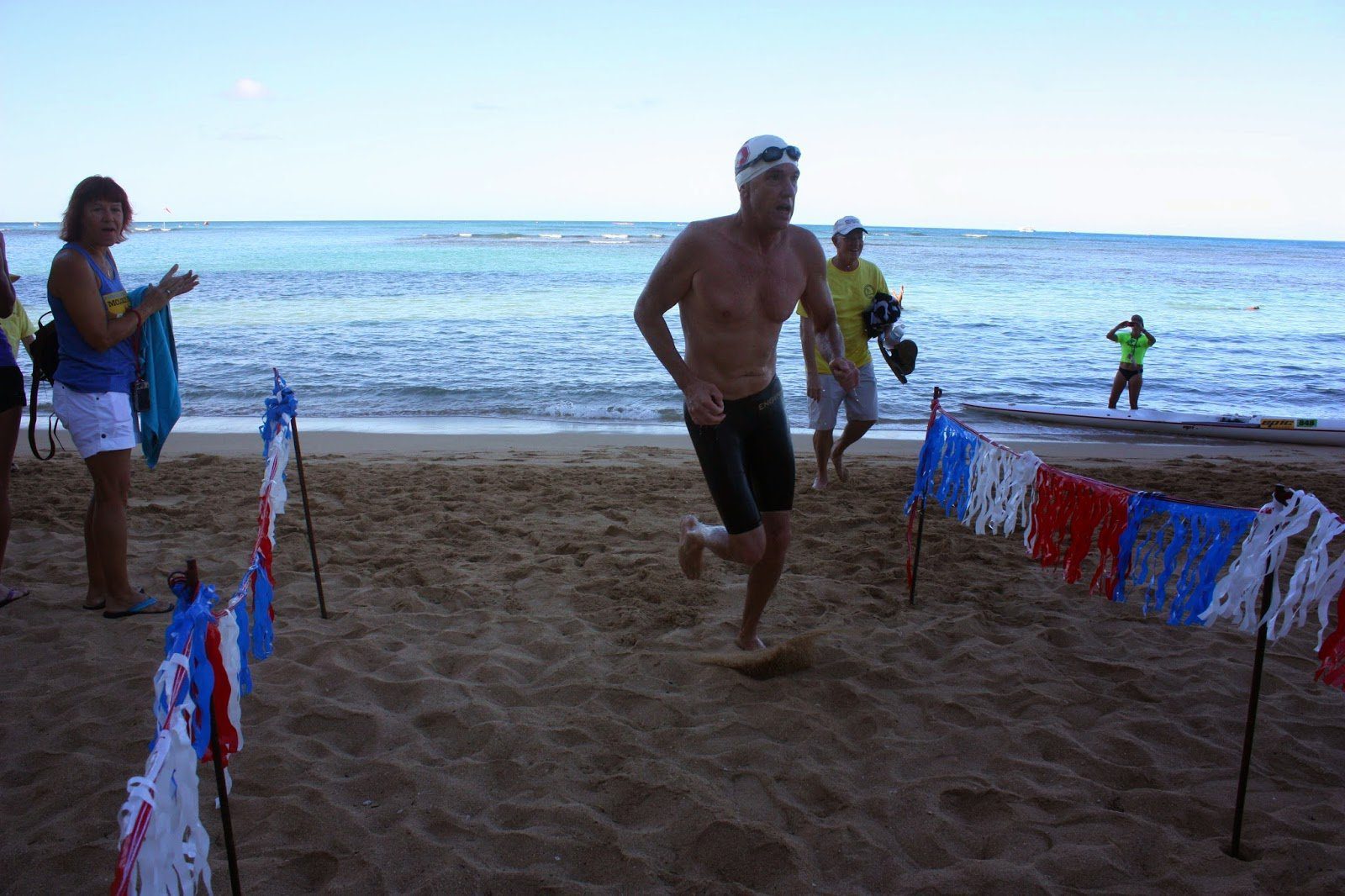 The 7 km out-and-back course along the outside surf in Waikiki Beach on Oahu goes over coral reefs and is notoriously tough for swimmers to be able to hold a straight line along the course without intermediate buoys.