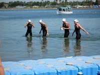Photo of the women’s start courtesy of Beth Barnes. The signage and festivities at the Pan Pacific Championships 10K marathon swim were courtesy of Run Racing.
