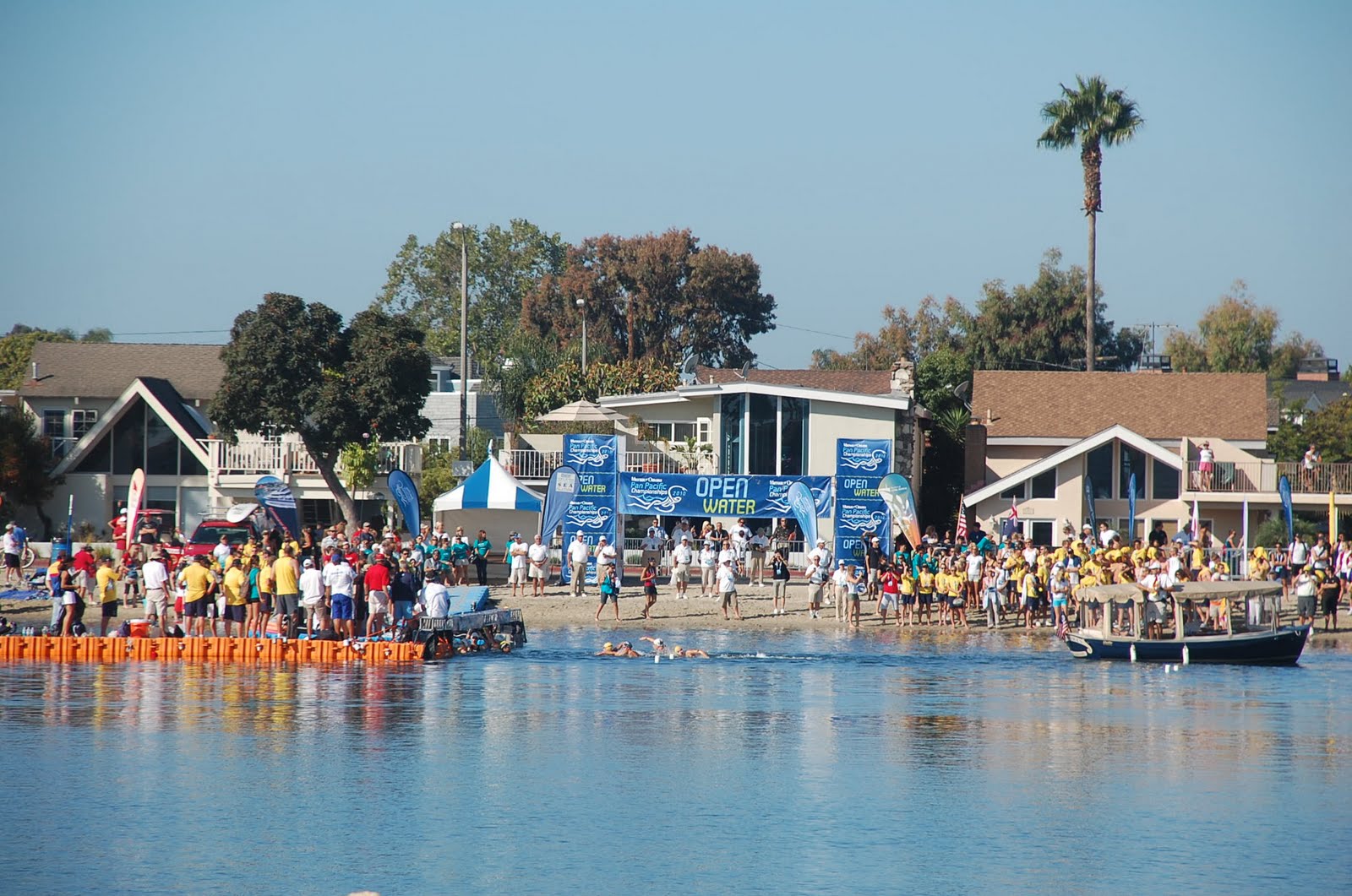 Photo of the women’s start courtesy of Beth Barnes. The signage and festivities at the Pan Pacific Championships 10K marathon swim were courtesy of Run Racing.