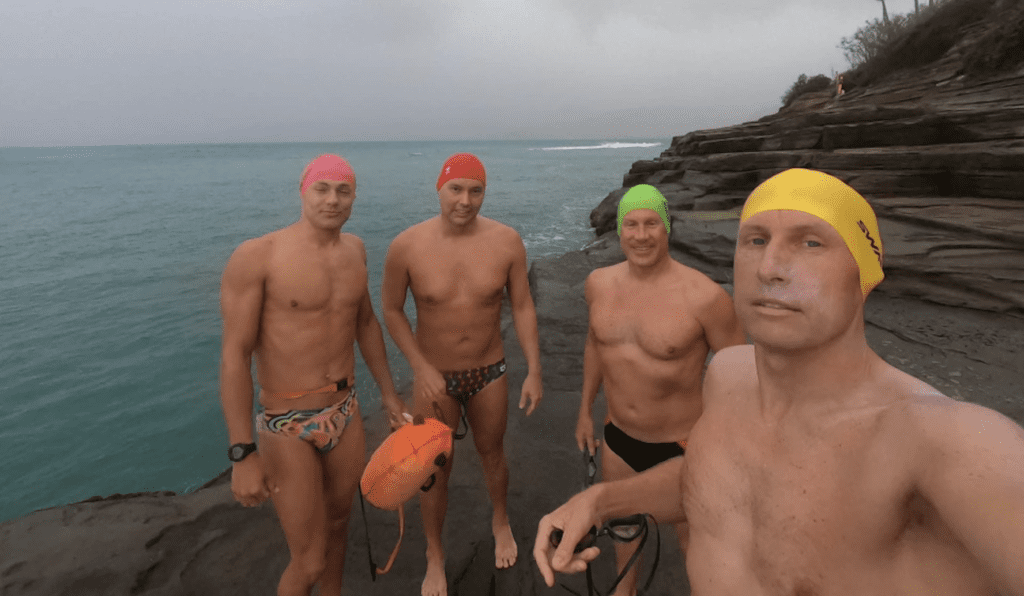 Dimsdale [shown below with local training partners in Honolulu] was on record pace through the first 20 miles, but he hit a head current with a few miles to go off Makapu’u on Oahu.