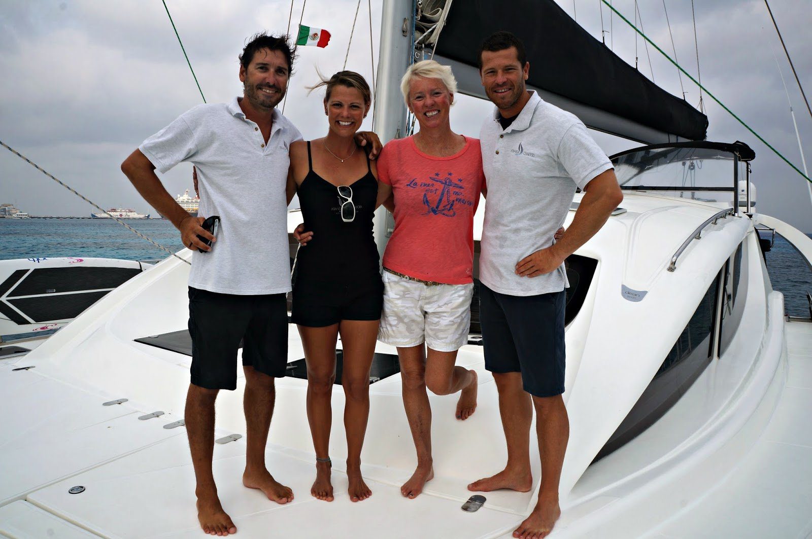 Upper photo shows Jennifer Figge approaching shore in Mexico. Lower photo shows Captain Tamas Hamor, first mate Sara Hajdu, Jennifer Figge and Romeo Szentgyörgyi.