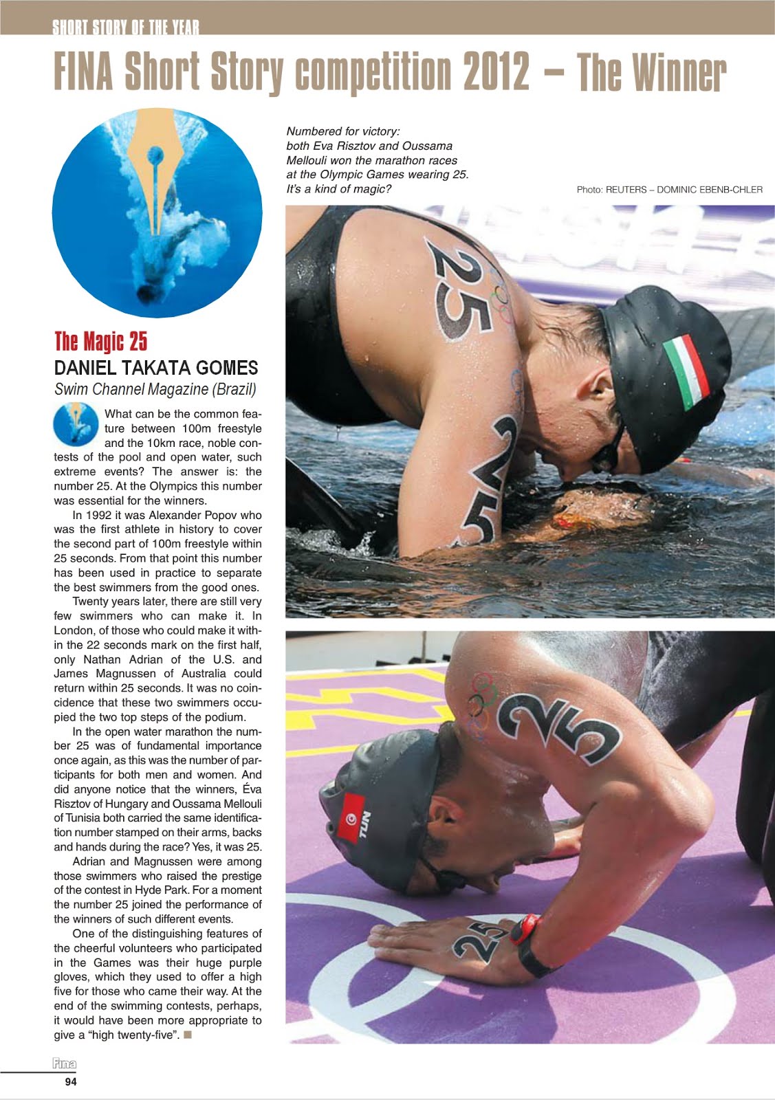 He also won the international short story competition held by FINA Aquatics World Magazine for the second consecutive year. His 2012 award-winning article was for his reporting of the Olympic 10K Marathon Swim at the 2012 London Olympic Games.