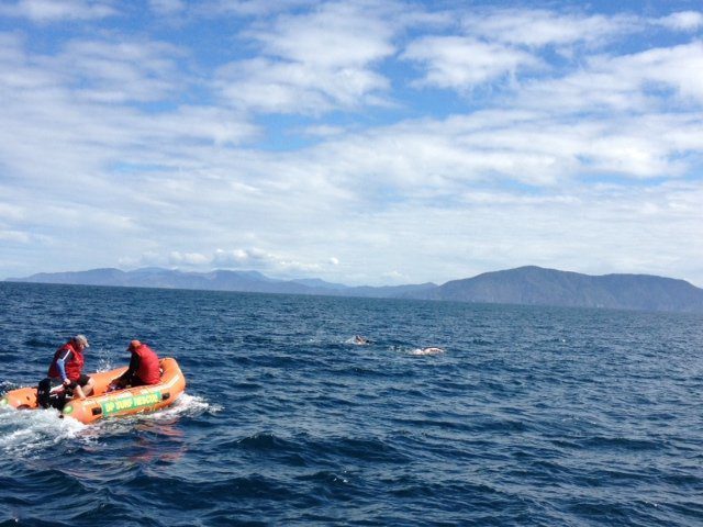 The swim itself was on a sunny, cool Thursday morning. We left the hotel at 6:30 am and were going to meet up with Philip down at Oriental Bay, however he was eager to get on the road so we actually met him at the same time coming out of our car park. We followed him in his Ford-150 (while hauling two rubber inflatable boats) to the Mana Cruising Club – about 20 minutes outside of Wellington. After off-loading the rafts, we pulled over and parked near the marina where our ‘boat to victory’, the 40-ft Tangaroa was docked. Captain Chris gave us the run down on his safety procedures, followed by Philip, and his swimming instructions. We left the dock, and took the 1.5-hour trip to the starting point on the North Island. The air temperature was about 15.9ºC (60.6ºF) with southwest winds blowing at 5-10 knots. We left at 9:42 am from the North Island, and started on our journey to the South Island. Water was incredibly clear, and cool – around 16ºC (60.8ºF). We could see straight down to the bottom. The sun was shining, and our swim was underway.