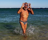 We stopped at the cape at the very western edge of the island, hoping to see some whales or other marine life and who should we see arrive a couple of minutes after us? Dieter! He had had another strong swim the day before and was now on a jaunt round the island. Just what you would do at age 68, the day after a 20K swim. We finished the ride with him, stopping here and there for a swim in the bays, and have been friends ever since.”