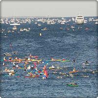 During my first Rottnest Channel Swim in 2000, halfway across the channel, the steering on my escort boat failed. After spending a fair bit of time treading water hoping they could fix the problem which they eventually didn’t, the choices were either end my swim or try to hook up with another boat. Even though I had lost a lot of time, I was determined to finish. It was decided that I would swim over to another boat, which I did. I explained my dilemma and the skipper said he was fine to guide both swimmers. He left the kayaker to guide us for a few minutes whilst he went to my boat to pick up my drinks.
