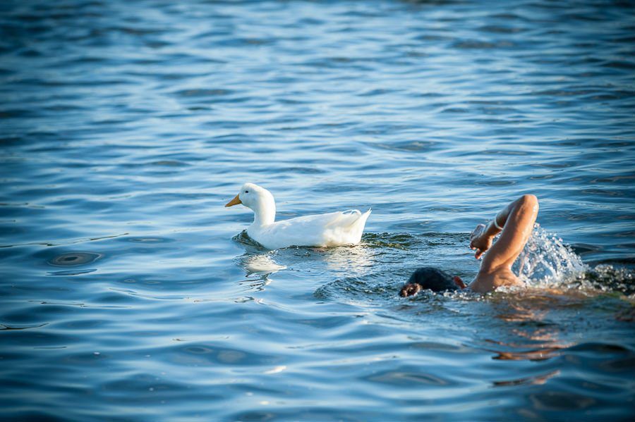 Open water swimmers can swim next to (or above or below) dolphins, turtles…geese, birds, seal lions, schools of fish…or ducks.