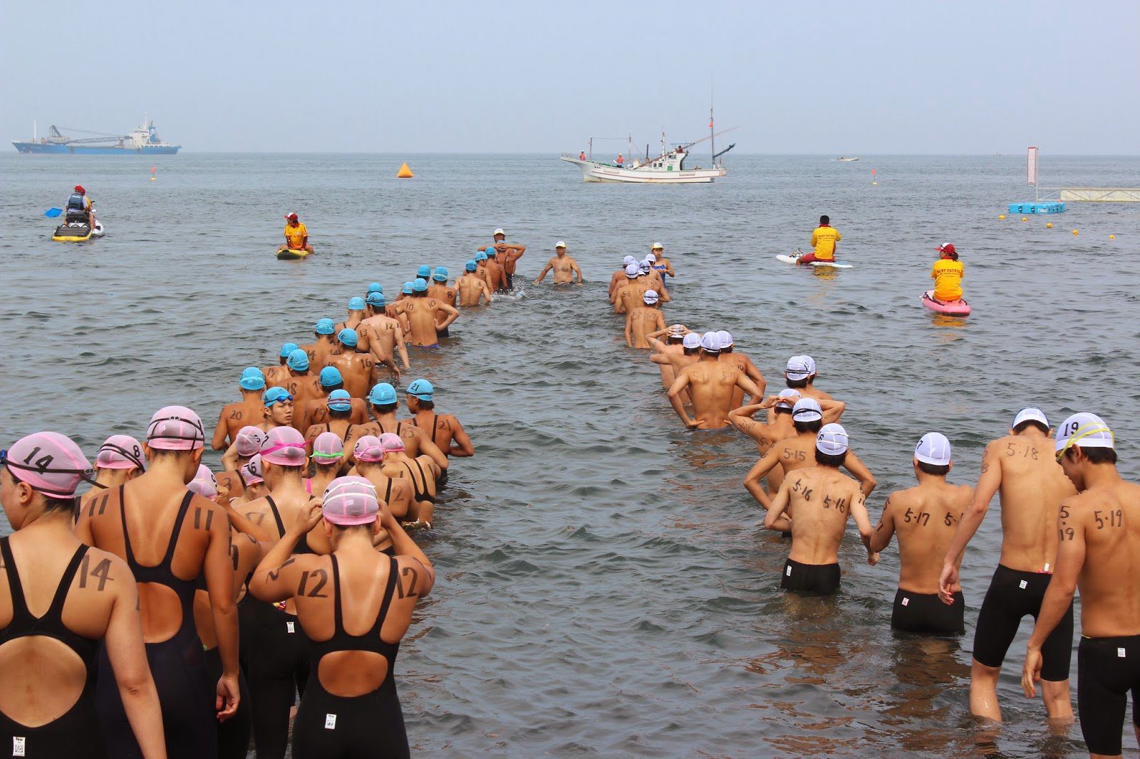 Lower photo shows the athletes walking in the water according to their numbers to the in-the-water start at the Open Water Swimming Japan Open Tateyama (オープンウォータースイミング ジャパンオープン2014館山) with 10 km men in blue, the 10 km women in pink, and the 5 km amateur field in white swim caps.