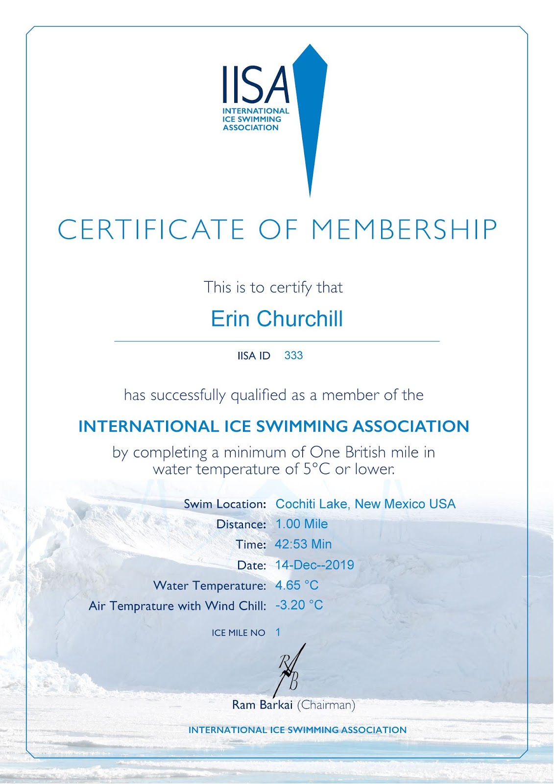 Then, she swam an Ice Mile in 42 minutes 53 seconds in Cochiti Lake in New Mexico, USA in 4.65°C water and -3.2°C air temperatures to become the 7th Iron Icewoman in history at the age of 38. “Out of all my athletic accomplishments – including the Ironmans and 100-mile ultramarathon runs, the Ice Mile was HANDS DOWN the hardest and scariest. I have a new respect for everyone who has ever completed an ice mile, and am honored to be amongst them.”