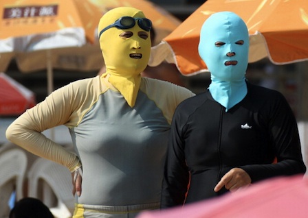 This past summer, the latest in marine protection has extended to the Chinese coastlines where women and children are protecting themselves against the sun with full-on facial facekinis. Harmful UV rays aren’t getting through that Lycra, but aren’t they worried about a goggle tan?