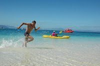 His run up the beach was the culmination of his 19K roughwater swim from the main island of Fiji to Beachcomber Island.