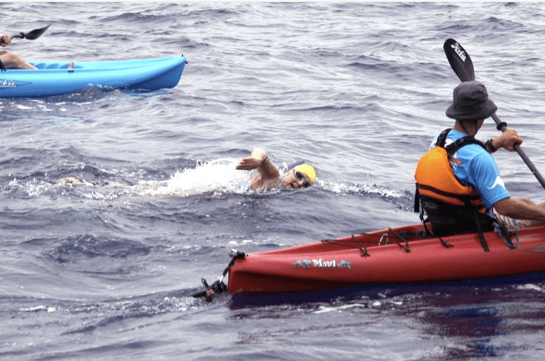 By the time, the large tub of ice cream was onboard and delivered in scoops to Palfrey’s escort kayakers, it had melted to slushy perfection and was easily enjoyed by the Australian marathon swimmer.