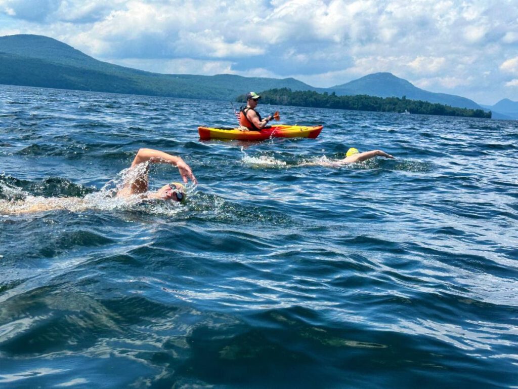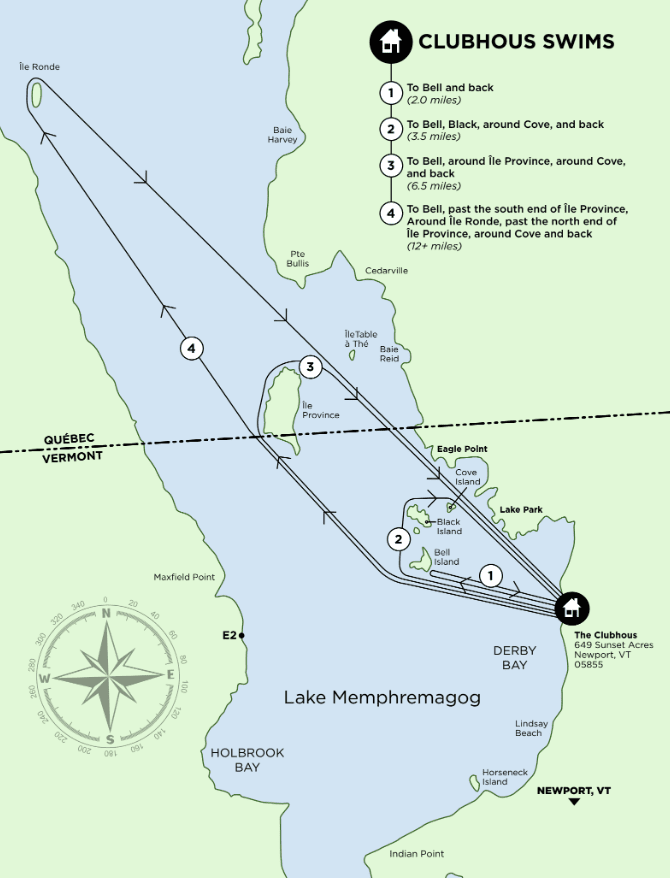 He explains, “We started the Saturday Clubhous Swim Series in Lake Memphremagog in Vermont as a small group event during the pandemic. We limited each Saturday to no more than 10 swimmers and 10 kayakers. We fell in love with it, as did many others, swimming from the Clubhous Beach out and around the islands of Derby Bay, one of the most beautiful parts of Lake Memphremagog.