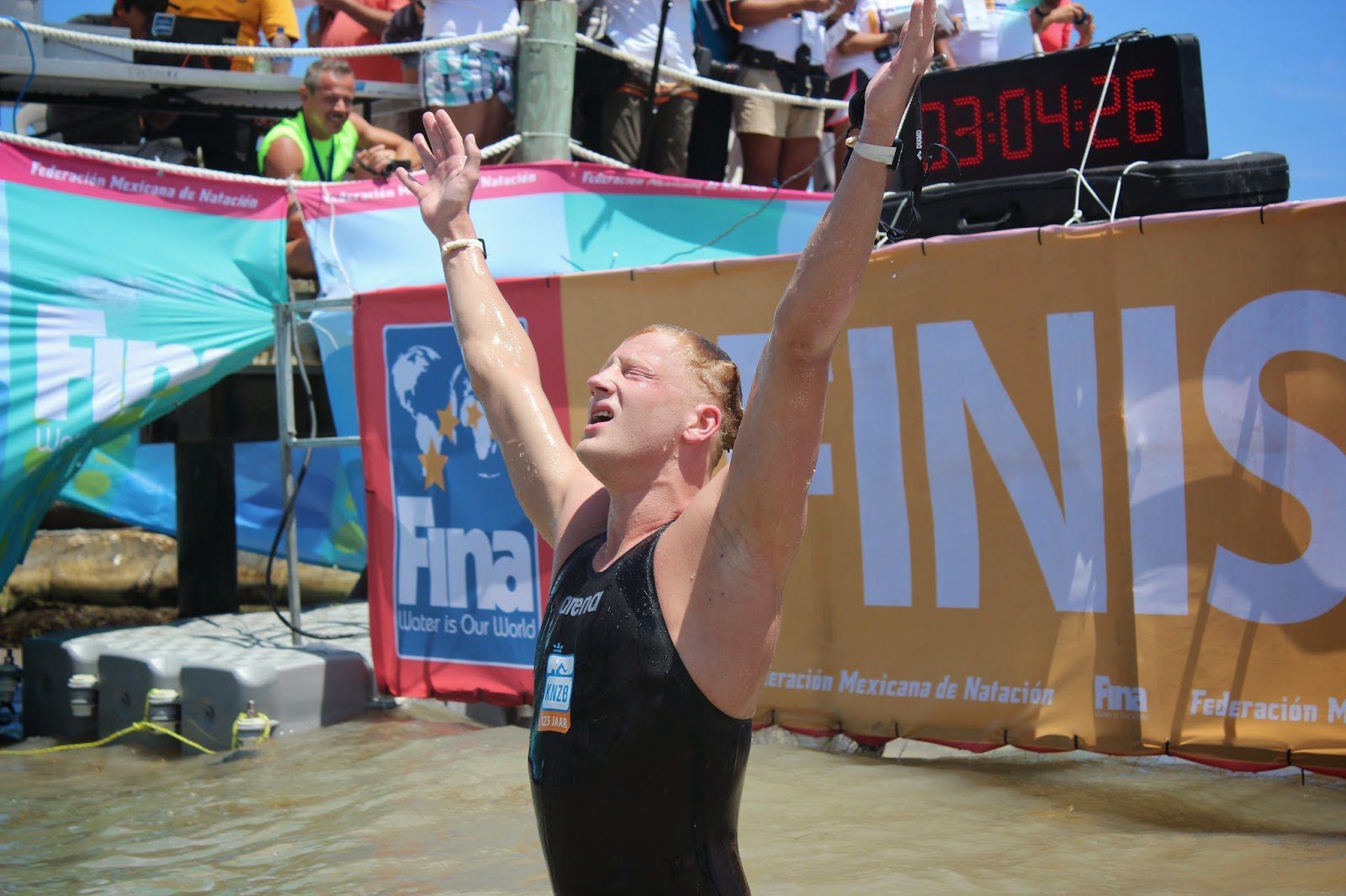 When an athlete crosses a finish line or touches ground after an open water swim, especially when they achieve their goal, their feeling of joy is obvious and apparent. Ferry Weertman of the Netherlands demonstrated his feelings seconds after winning the 15 km FINA Open Water Swimming Grand Prix off the Ocean Maya Royale resort in Playa del Carmen, Mexico.