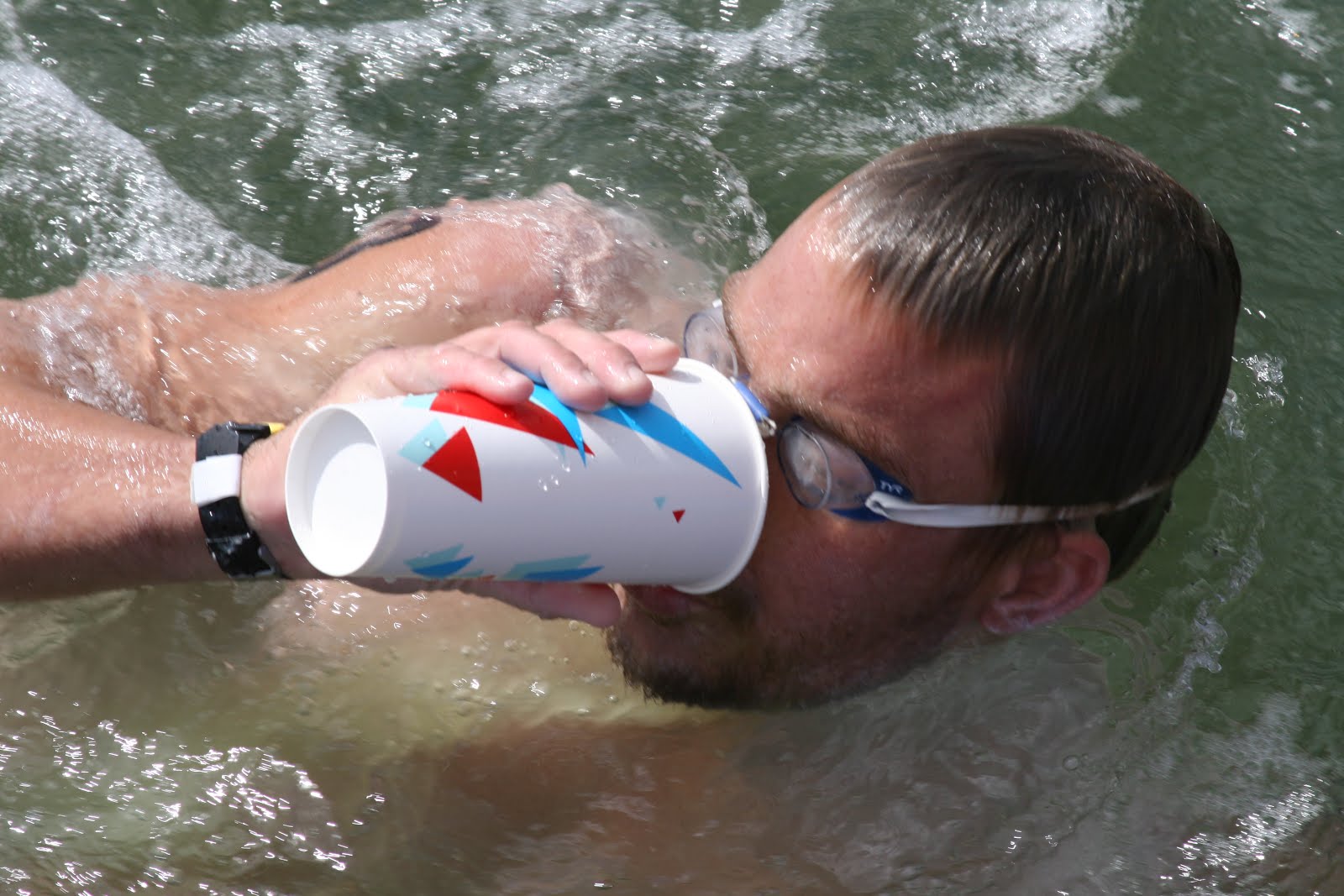 Watch a marathon run or triathlon in warm conditions. The runners and triathletes hydrate over the entire race, taking in liquids over the course of a 100 meters and constantly sucking on their water bottles. In contrast, the marathon swimmers take quick sips under 5 seconds as they pass through a single feeding station (in a loop course) or every 15-30 minutes if they have an escort boat. Of course, it is the decision of the athlete and their coach how often they hydrate, but hydration is a much more complex action in the water during a marathon swim than it is during a marathon run or triathlon on land.