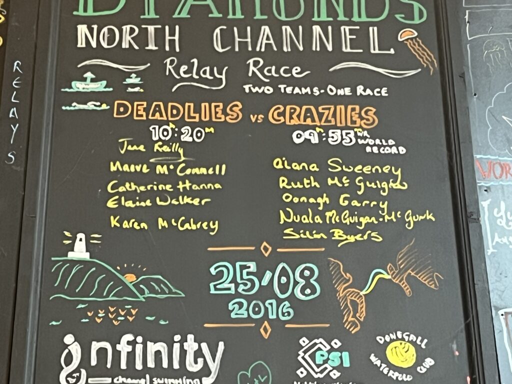 Yet 183 men and women have successfully crossed the channel since Tom Blower (MSF bio here) first did it in 1947 in 15 hours 26 minutes with the escort of pilot Andrew White (commemorated by the paintings below in Pier 36 in Donaghadee). But it took another 23 years before the second successful swimmer Kevin Murphy (MSF bio here) in September 1970 traversed the tough channel in 11 hours 21 minutes under the guidance of pilot Captain William Long.