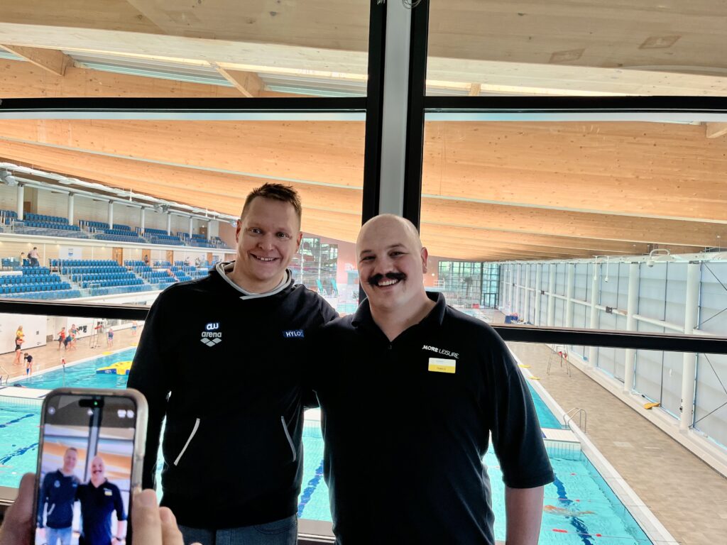 While waiting for swimmable conditions, there are plenty of places to train for and acclimatize to the North Channel. In Bangor, a 50m pool within the Bangor Aurora Aquatic and Leisure Complex, managed by Pearce Jamison [shown below to the right of Andreas Waschburger), affords pool training with a digital pace clock. The pool is located at 3 Valentine Road, Bangor, Co-Down, Northern Ireland BT20 4TH.