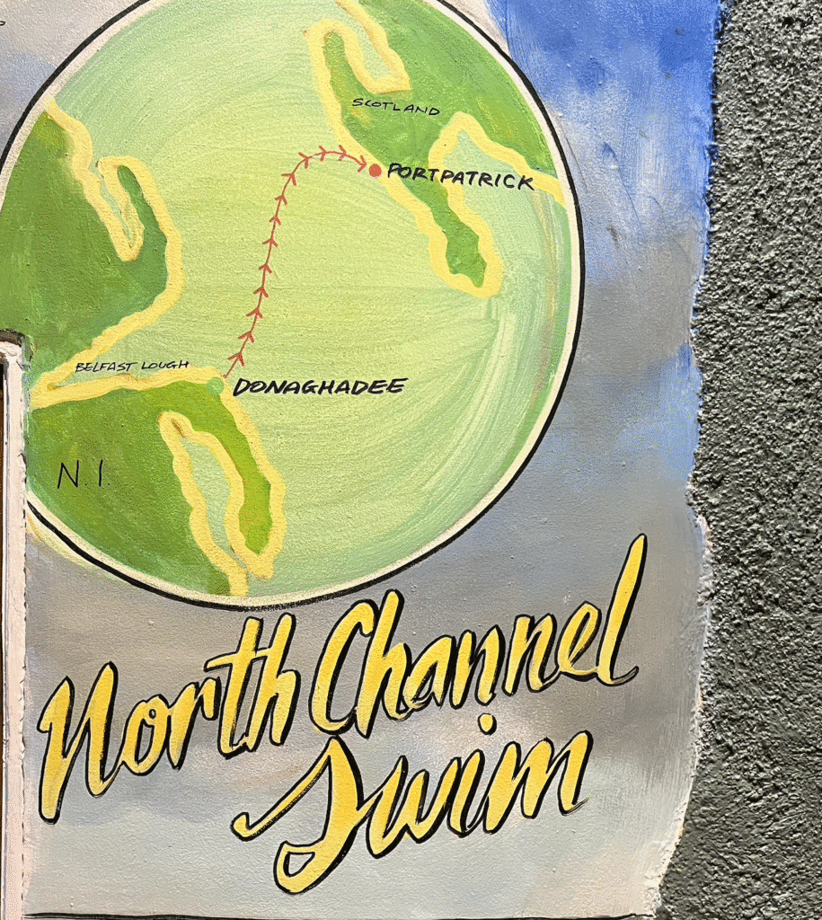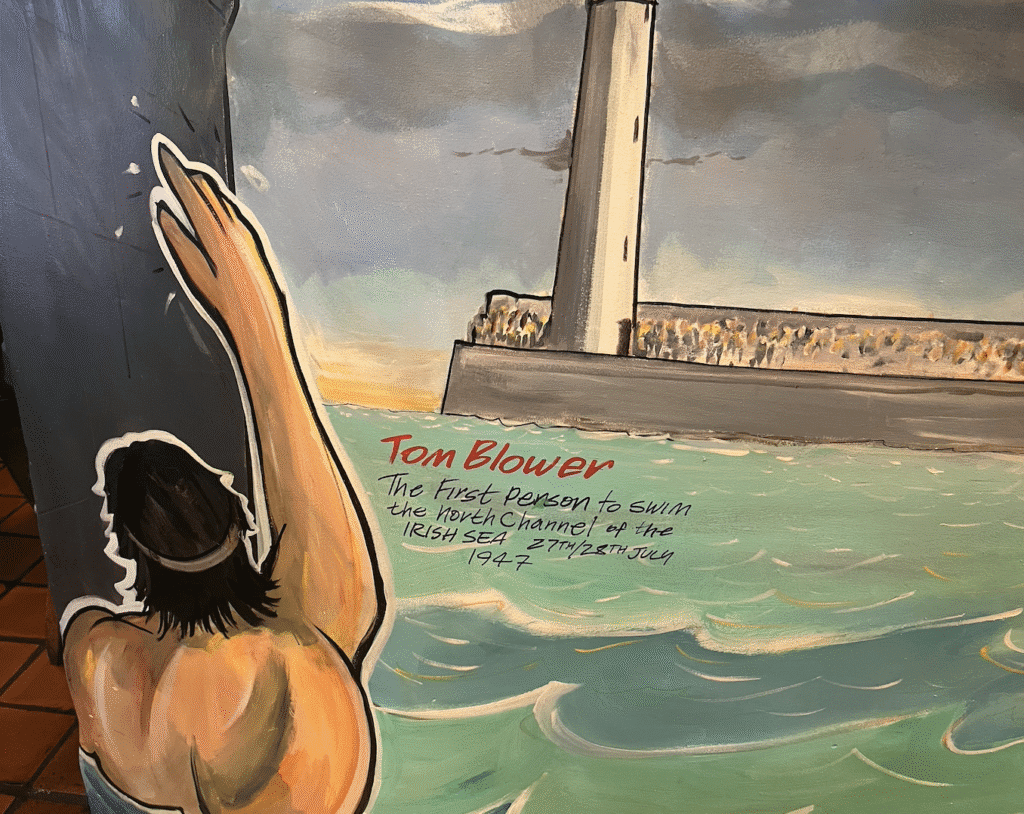Yet 183 men and women have successfully crossed the channel since Tom Blower (MSF bio here) first did it in 1947 in 15 hours 26 minutes with the escort of pilot Andrew White (commemorated by the paintings below in Pier 36 in Donaghadee). But it took another 23 years before the second successful swimmer Kevin Murphy (MSF bio here) in September 1970 traversed the tough channel in 11 hours 21 minutes under the guidance of pilot Captain William Long.