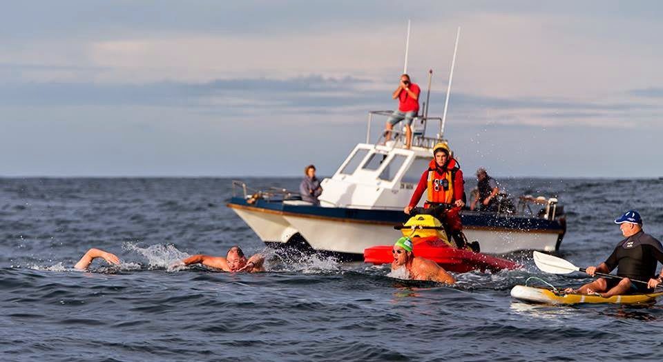 Now they had a rough water struggle on their hands. Depending on the skills of their escort boat pilot John Hendrick, the swimmers slogged through the currents and went up and over the big swells breaking on the headland. They eventually make it into the safety of the port in a time of 3 hours 38 minutes.