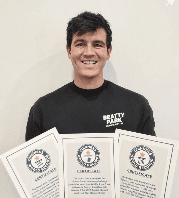 The 38-year-old German is ready to break the overall speed record of 63 hours 2 minutes, currently held by Andy Donaldson (34, Scotland, MSF bio here, @andy.swimming, shown below). His cumulative time (not inclusive of the North Channel) is 41 hours 24 minutes.