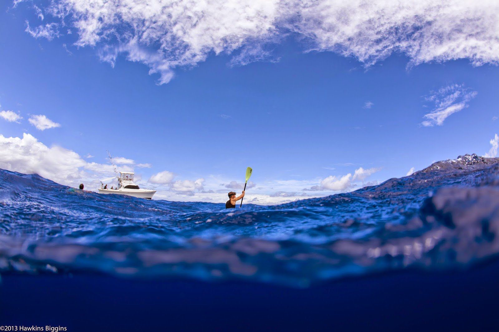 Up and down and left and right, open water swimmers are often tossed about in the open seas. Hawkins Biggins captures what the ocean swimmers view through their goggles under dynamic conditions in the Molokai Channel above.