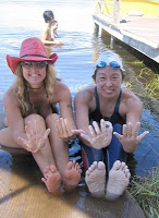 Photo shows Yuko Matsuzaki after her 83 km solo swim in Lake Cane, Florida where she swam non-stop for 33 hours 24 minutes. “Right after I finished the marathon swim, I walked onshore and my sweet friend gave me some “shiatsu” massage slipper” with many bumps on the slippers. My feet were super wrinkled after the swim. I had weak skin and it was waaaaaaaaaaaay too painful. I threw away the slippers and learned, “After long swim, no shiatsu massage shoes.”