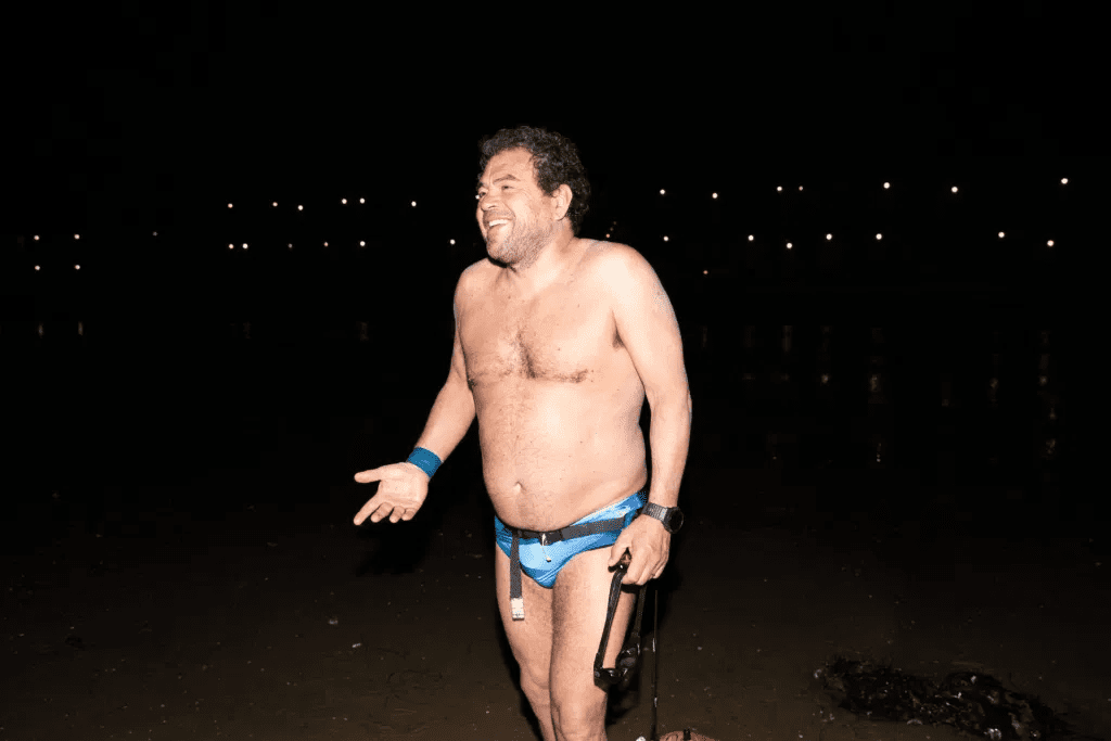 This is his hallmark. His determination is so great that it makes you want to jump into the water and know what it feels like to float without feeling your feet or arms due to the cold. Some say that this is where the human being is most similar to an animal, without being able to stand, or see from afar, or hear clear sounds, or speak to anyone.
